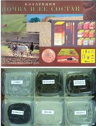 В коллекции представлены образцы почв: чернозёмная, подзолистая, болотная торфяная, песок, глина, перегной. Образцы почв помещены в пластмассовые контейнеры с крышкой и снабжены этикетками согласно списку. Изделие упаковано в коробку с маркировкой, которая покрыта термоусадочной плёнкой.