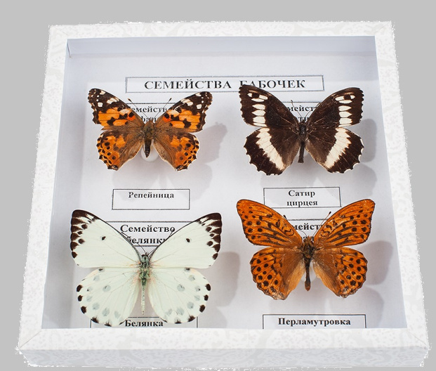 В монтажной коробке под стеклом представлены (не менее 2-ух) насекомые некоторых семейств отряда Чешуекрылые (Бабочки). По особенностям жилкования крыльев и некоторым другим признакам чешуекрылых делят на семейства, которых насчитывается более тридцати.