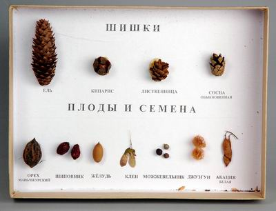 Коллекция представлена цветным, заламинированном планшетом из плотного картона формата А4 и наклеенными на него объектами: шишки голосеменных растений - 4 вида, плоды и семена деревьев и кустарников - 7 видов. Представлены натуральные образцы шишек, плодов и семян наиболее распространенных деревьев и кустарников, что позволяет продемонстрировать особенности строения шишек, семян и плодов, их сходства и различия. Планшет упаковывается в коробку с маркировкой.