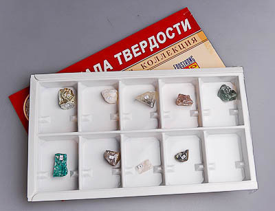 Образцы пронумерованы соответственно значению твердости по шкале Мооса и положены в коробку с ячейками (образец с твердостью 10, алмаз, не представлен).