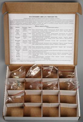 В коллекции представлены 9 минералов с постоянной твёрдостью от 1 до 9. Они не предназначены для испытаний. Коллекция снабжена списком с наименованием образцов. Номер в списке соответствует твёрдости образца. Указания по определению твёрдости образцов минералов, предназначенных для испытания, указаны в приложении к коллекции. Опыты можно проводить как в школе, так и в полевых условиях во время экскурсий. Для испытаний подбираются образцы в полевых условиях или из раздаточных коллекций.