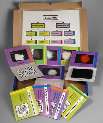 Характеристики изделия, размер и вес - в коллекции представлены 10 образцов волокон и тканей, смонтированных на картонных паспарту. Волокна и такни по составу: натуральные (растительного и животного происхождения), искусственные, синтетические, химические. Паспарту уложены в складную коробку. Коробка упакована в прозрачную термоусадочную плёнку. На коробке печатным способом нанесено: - наименование коллекции; - наименование предприятия- изготовителя и его адрес. Размер упаковки не более 320х230х45мм. Вес не более 0,5кг.