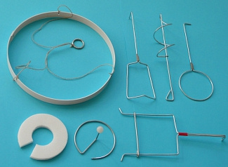 В состав комплекта входит набор проволочных рамок различной конфигурации, рамка с подвижной стороной, кольцо с подвесом, проволочное кольцо с отгибом к центру, плоское кольцо с прорезью и укладочная кювета.