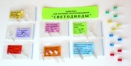 В состав комплекта входят светодиоды различного цвета свечения, двухцветные, трехцветные, многоцветные с плавным изменением цвета, мигающие, ИК и УФ светодиоды.