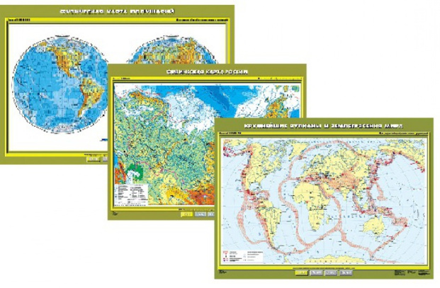 В комплект входит 12 карт: Физическая карта полушарий (формат 100х140 см.) Политическая карта полушарий (формат 100х140 см.) Политическая карта мира (формат 100х140 см.) Великие географические открытия (формат 100х140 см.) Топографическая карта и условные знаки (формат 70х100 см.) Природные зоны России (формат 100х140 см.) Физическая карта России (формат 100х140 см.) Физическая карта Арктики (формат 70х100 см.) Физическая карта Антарктики (формат 70х100 см.) Океаны (формат 100х140 см.) Крупнейшие вулканы и землетрясения мира (формат 100х140 см.) Физическая карта мира (формат 100х140 см.)