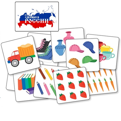 * Наборы раздаточных карточек для работы индивидуально или в парах. Карточки повторяют демонстрационный набор, но без магнитов и меньшего размера. На обороте карточек изображены числа, соответствующие количеству предметов на лицевой стороне.