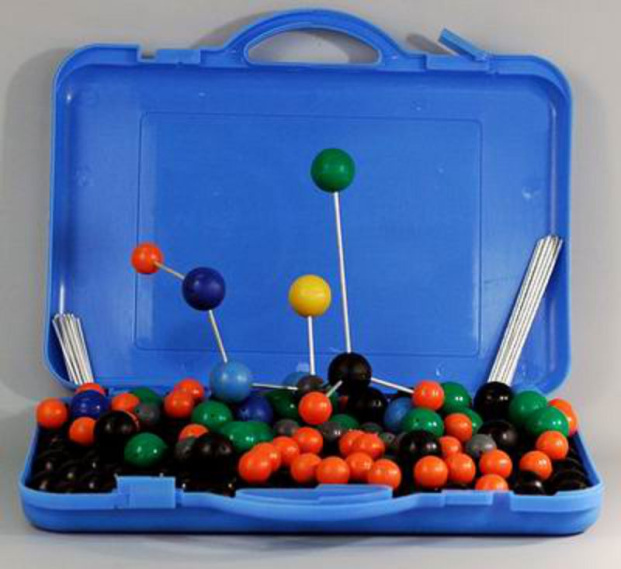 В набор входят 175 пластмассовых шаров разного цвета и диаметра (имитация атомов). На них имеются отверстия для соединительных стержней разных видов по длинне:125 металлических (для одинарных связей) и 10 металлических гибких (для моделирования двойных и тройных связей). Шары и стержни разложены по пакетам и уложены в пластмассовый футляр на котором наклеена этикетка с маркировкой.