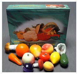 Муляжи представляют собой образцы, имитирующие натуральные фрукты, овощи, грибы. Они изготовлены из полистирола вспенивающегося, окрашены в соответствии с эталоном масляными красками, цветным парафином. Для отделки используются натуральные или искусственно изготовленные черешки и чашечки, лесная подстилка, крахмал и тальк. Уложены муляжи в складную картонную коробку с ячейками. Коробка упакована в прозрачную термоусадочную плёнку.