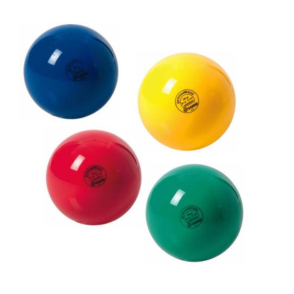 Комплект из четырех мячей из высококачественного рутона разных цветов (синий, красный, зеленый, желтый). Мячи отличаются большой упругостью и высоким отскоком.