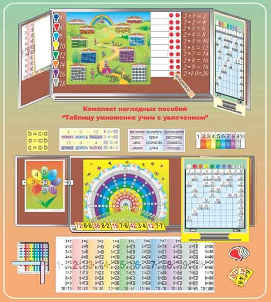 Комплект наглядных пособий Таблицу умножения учим с увлечениемКомплект 11 демонстрационных пособий (картон, полиэтилен, цветная печать): Таблица умножения (600 х 900 – 2 листа). Город умножения (900 х 1100). Таблица с цветовым кодом (900 х 1200). Радужный цветок (900 х 1200). Цветик-семицветик. Радужная лента. Названия компонентов. Домино. Абак (750 х 880). Цветовые сигнальные карточки – 28 шт. Квадрат с уголком – 28 шт.