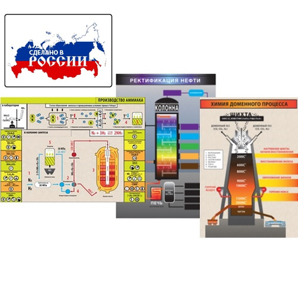 Демострационное учебное пособие представляет собой 3 магнитных плаката с набором каточек для составления модели-аппликации по химическим производствам.