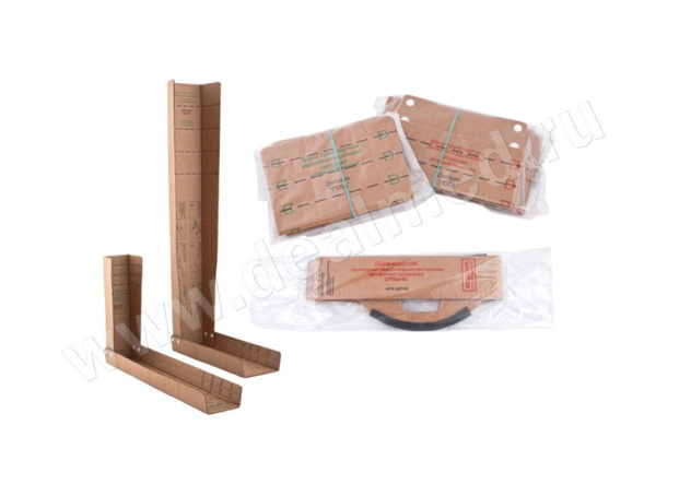 Описание: шины для транспортной иммобилизации конечностей представляют собой пластины специальной формы из картона с продольной и поперечной перфорацией для легкого моделирования любого размера шины по конечности. Крепление шин производиться с помощью бинтов.