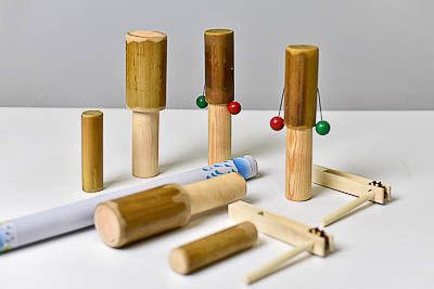 Музыкальные инструменты изготовлены из натурального дерева (сосна, бук), пищевого пластика. Карточки формата А5 изготовлены из картона, ламинированы пленкой. Печать полноцветная. На карточках изображены шумовые музыкальные инструменты, входящие в комплект, а также животные, предметы и явления природы, звуки которых можно передать с помощью шумовых музыкальных инструментов.