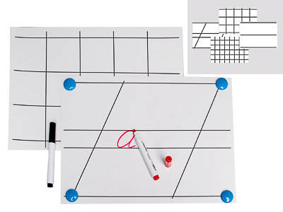 Таблицы напечатаны на двух листах формата А3 (двусторонняя печать). В комплект входят следующие таблицы: таблица для демонстрации техники письма букв на узких линейках, таблица для демонстрации техники письма букв на широких линейках, таблица для демонстрации техники письма цифр в крупных клетках, таблица для демонстрации правильного оформления математических записей. Таблицы ламинированы глянцевой пленкой, применяются по принципу "пиши–стирай". Используется маркер для белых досок. Написанное стирается сухой тряпкой.