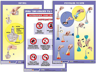 2. Инструктивные таблицы: "Спиртовка", "Электронагреватели", "Приемы обращения с лабораторным штативом", "Обращение с твердыми веществами", "Обращение с жидкими веществами", "Нагревание", "Получение и собирание газов". "Взвешивание", "Приготовление растворов", "Фильтрование", "Перегонка", "Титрование".