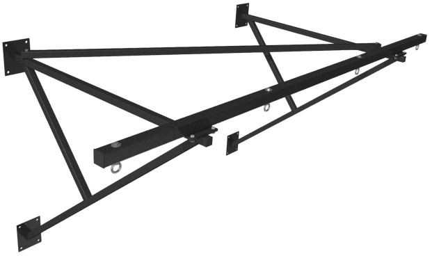 Подвесное устройство для канатов предназначено для крепления 4-х снарядов для лазания в спортивных залах. Конструкция выполнена из профильной трубы 60х60мм, цельносварная. Подвеска состоит из двух кронштейнов, крепящихся к стене спортзала и поперечной балки с четырьмя точками подвески снарядов. Длина балки -3000мм, вынос от стены снарядов 1500мм, расстояние между снарядами 950мм. Грузоподъемность - 600 кг.Окрашена порошковой эмалью.