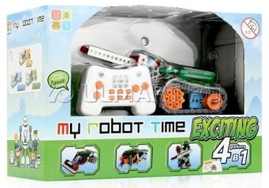 My Robot Time exsiting . состоит из не менее 197 деталей (упрощены схемы сборки по просьбе родителей), в т.ч. материнская плата, 2 DC двигателя, пульт с возможностью выбора одного из 8 каналов управления. Иллюстрированная брошюра по сборке.