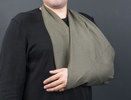 - поместите конечность чуть ниже середины косынки, прямой угол которой направлен в сторону локтя, а основание располагается на груди по оси тела;