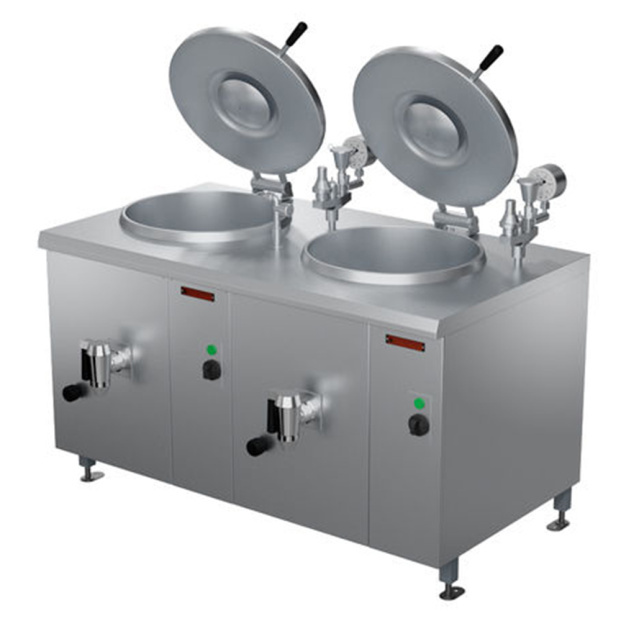 Рабочий объем составляет 150 л (по 75 л каждая варочная емкость). Наличие двух пищеварочных сосудов, встроенных в общий корпус, которые могут работать как вместе, так автономно.
