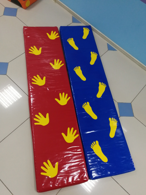 Состоит из двух матов с нанесенными следами ручек и ножек. Длина мата: 170 см, ширина: 40 см, толщина: 4 см. Материал: тент, наполнитель поролон. Рекомендуется для использования на физкультурных занятиях, а также на занятиях лечебной физкультурой в детских садах. Занятия с ковриком способствуют развитию координации движений, укреплению мышц ног, рук и спины, развитию внимания.