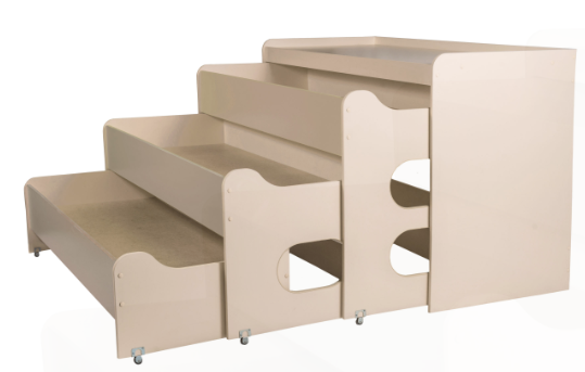 модель состоит из трех спальных мест, располагаемых друг над другом. Во время отдыха кровати легко выкатываются из ниши. В сложенном состоянии конструкция становится очень компактной, что позволяет оставить много свободного пространства для учебы и развлечений.