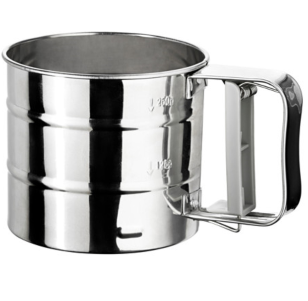 Корпус кружки с двойным ситовым дном и ручкой, внутри которой находится пружина. Благодаря ручке-рычагу мука с легкостью просеивается без лишней тряски и не рассыпается. Материал: нержавеющая сталь