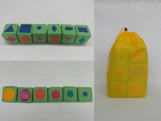 Набор состоит из 6 мягких кубиков и сумки На каждой грани кубика нанесена аппликация – геометрическая фигура.