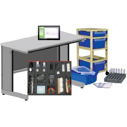 В состав комплекса входит лабораторное оборудование и комплектующие для постановки эксперимента, современные цифровые датчики и микроскоп, позволяющие фиксировать данные в автоматическом режиме, планшет для обработки и анализа данных, методические рекомендации для педагога и рабочие листы для учащихся, система хранения и учебный лабораторный стол.