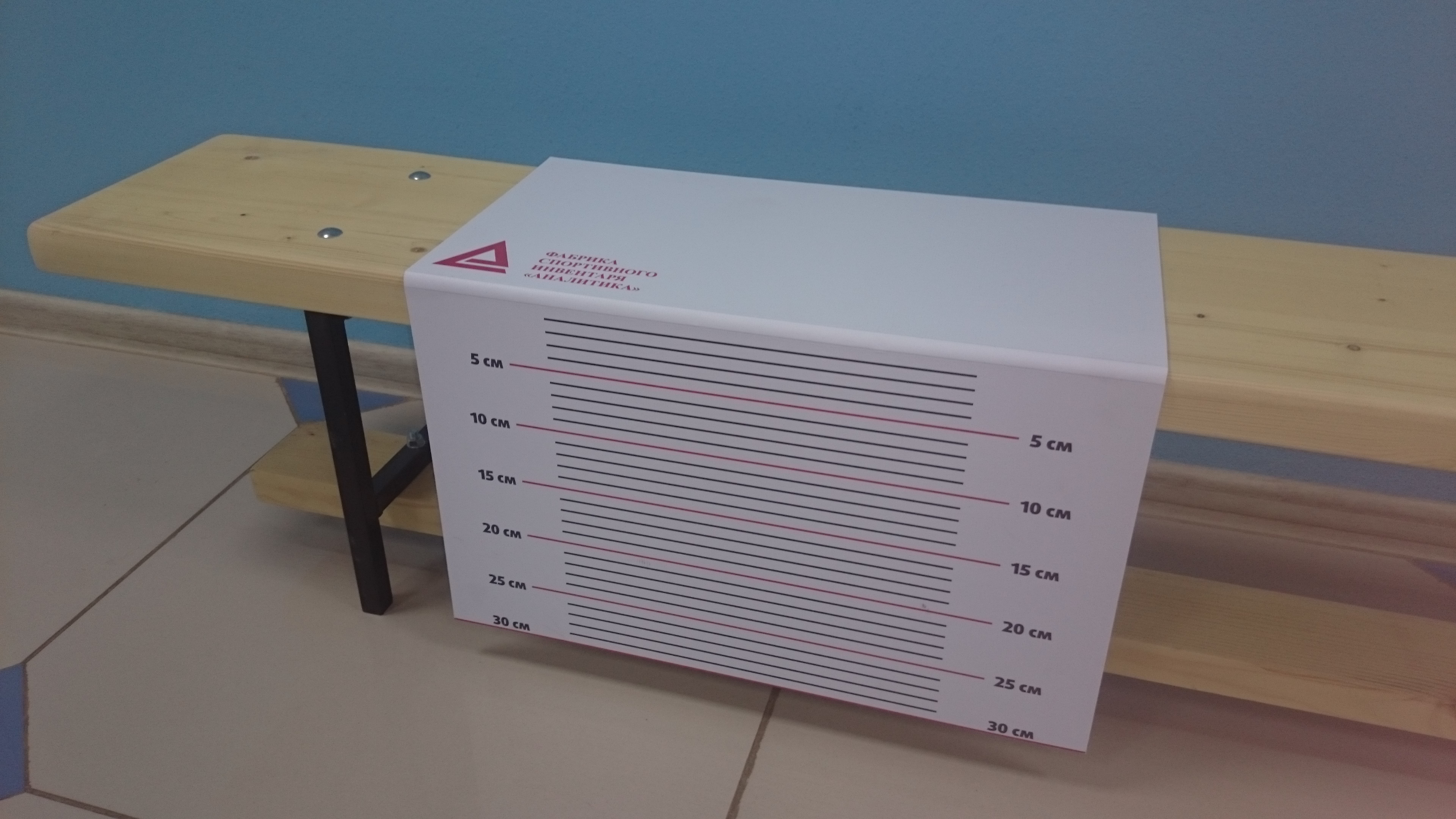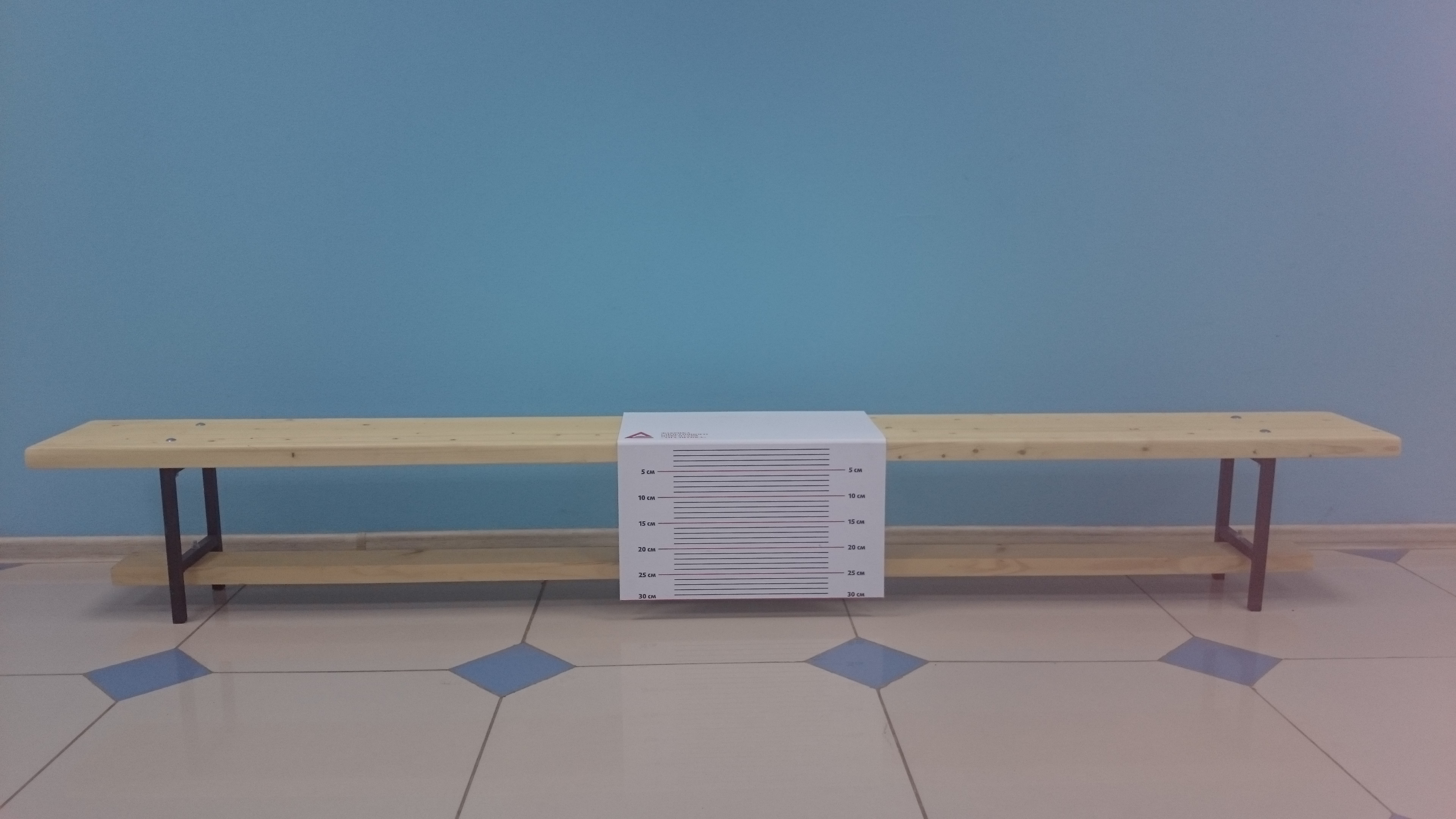 Линейка предназначена для измерения глубины наклона вперед. Линейка имеет две поверхности: одну для размещения на скамейке, другую, перпендикулярную ей, для измерения. Возможно изготовить по индивидуальному дизайну.
