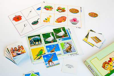 Комплектность: планшеты с изображениями – 6 шт., карточки с изображениями и подписями – 36 шт. (на обратной стороне каждой разрезной картинки приведено ее название на английском, немецком и русском языках), методические рекомендации с правилами игры – 1 шт.