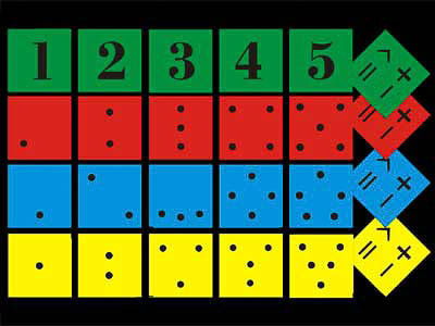 В набор включены квадраты четырех разных цветов с нанесенными на них кружочками и цифрами, причем одинаковое количество кружочков на квадратах разного цвета расположены по-разному.