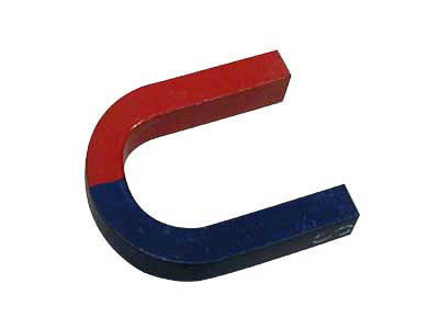 Магнит U-образной формы изготовлен из полосовой стали. Половины магнита окрашены в разные цвета. Разноименные полюса магнитов замкнуты стальной пластиной.