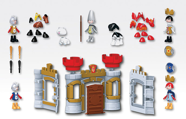 Набор «Замок рыцарей» включает 60 деталей, из которых можно построить одновременно 9 фигурок для сюжетной игры: два принца, два рыцаря, стражника, лошадь, кошку, собаку и дракона. Кроме того, в набор входят дополнительные детали: замок рыцарей, седла для лошадей, короны, шляпы, мечи, щиты, которые можно вставить в руки персонажей. Каждая фигурка состоит из нескольких частей: туловище, голова, ноги и разные аксессуары (шляпа, меч и др.).
