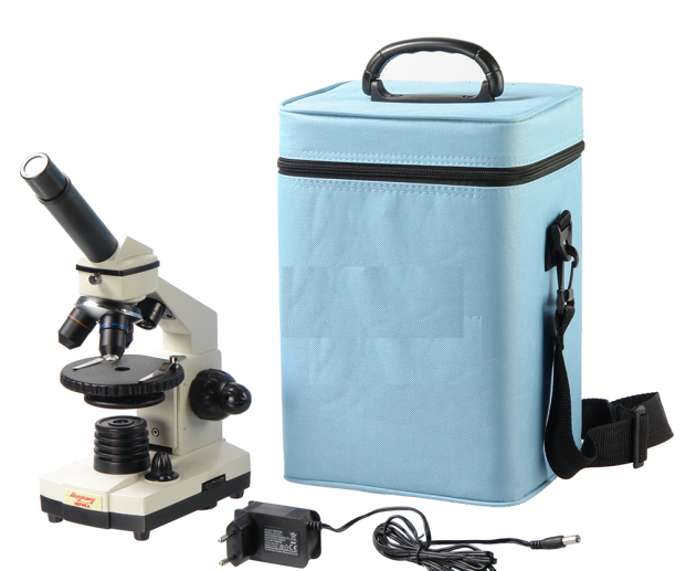 Осветитель работает от батареек/аккумуляторов - 3 шт. типа AA, 4.5B и от сетевого адаптера. Адаптер в комплекте. Универсальность питания осветительной системы позволяет использовать микроскоп и в учебных классах, и в походных условиях. Обеспечивает мобильность оборудования.