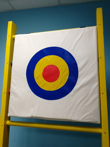 Изготовлен из винилискожи, наполнитель поролон. Щит крепится на шведскую стенку при помощи липучек.Размер 70*70см, толщина 2см.