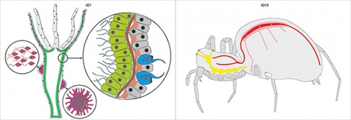 1) Пищеварительную (зеленый, пищеварительные железы выделены коричневым), дыхательную (голубой) и мочеполовую системы (органы выделения – розовые, репродуктивные органы – фиолетовые).