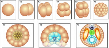 Пособие состоит из 9 цветных карточек модели-аппликации, напечатанных на картоне и ламинированных матовой (антибликовой) пленкой. На карточках изображено деление оплодотворенной яйцеклетки (яйцеклетка, стадии 2, 4, 8, 16, 64 бластомеров), образование бластулы, гаструлы и нейрулы. Карточки располагают на доске согласно номерам.