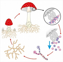 Пособие состоит из 6 цветных карточек модели-аппликации, напечатанных на картоне и ламинированных матовой (антибликовой) пленкой. На карточках изображены стадии развития и полового размножения шляпочного гриба (Мухомора). Пособие снабжено магнитным креплением, что позволяет монтировать схемы на магнитной доске.