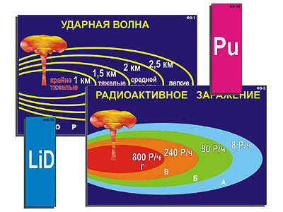 Модель-аппликация иллюстрирует принцип действия урановой, плутониевой и водородной бомб, знакомит с поражающими факторами ядерного взрыва, существенно дополняя материал школьных учебников по данной теме.