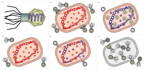 Пособие состоит из 6 цветных карточек модели-аппликации, напечатанных на картоне и ламинированных матовой (антибликовой) пленкой. На карточках изображены стадии развития Бактериофага. На доске карточки располагаются согласно номерам кругом по часовой стрелке. Пособие снабжено магнитным креплением, что позволяет монтировать схемы на магнитной доске.