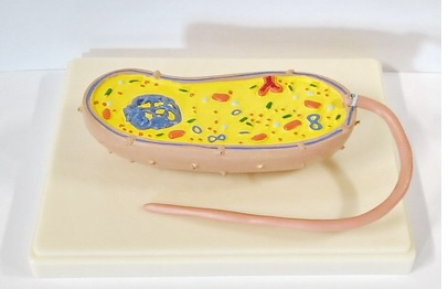Модель неразборная, цветная, изготовлена из пластмассы и закреплена на подставке. На модели можно рассмотреть следующие особенности строения клетки бактерии: