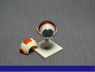 Модель изготовлена из пластмассы и установлена на пластмассовой подставке. Высота модели ≈ 15см. Модель является разборной, изображает глаз человека, демонстрирует строение зрительного анализатора. На модели цветом выделены следующие детали строения: 1. Фиброзная оболочка (склера) 9. Задняя камера глазного яблока 2. Собственно сосудистая оболочка 10. Ресничный поясок 3. Сетчатка 11. Ресничное тело 4. Радужная оболочка 12. Сосудистое тело 5.Зрачок 13. Желтое пятно 6. Роговица 14. Диск зрительного нерва 7. Хрусталик 15. Зрительный нерв 8. Передняя камера глазного яблока