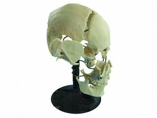 Данная модель позволяет наглядно продемонстрировать кости, составляющие череп человека. А также характер соединения их между собой. Кости черепа модели изготовлены из пластмассы и точно имитируют натуральные. Все они смонтированы на подставке и могут, при необходимости, разворачиваться вокруг оси модели, высота модели не менее 29 см. На модели можно рассмотреть следующие кости черепа человека: 1. Лобная кость 7. Верхнечелюстные кости с носовыми раковинами 2. Теменные кости 8. Слезные косточки 3. Клиновидная кость 9. Носовые косточки 4. Височные кости 10. Сошник 5. Затылочная кость 11. Скуловые кости 6. Решетчатая кость 12. Нижняя челюсть