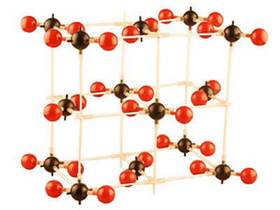 Демонстрационное пособие представляет собой модель, состоящую из красных шаров, обозначающих атомы кислорода, черных шаров, обозначающих атомы углерода, и соединительных трубок и стержней, обозначающих связи.