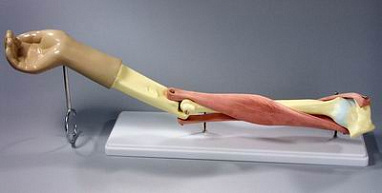 Модель представляет собой верхнюю конечность человека. Длина ее составляет ≈ 65см. Модель устанавливается на подставку, кости скелета модели изготовлены из пластмассы, а мышцы - из резины. На модели можно рассмотреть следующие детали строения локтевого сустава: 1. Кисть 4. Плечевая кость 2. Локтевая кость 5. Мышца- сгибатель (двуглавая мышца) 3. Лучевая кость 6. Мышца- разгибатель (трехглавая мышца)