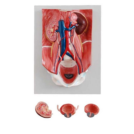 Демонстрационное учебное пособие представляет собой модель мочевыделительной системы человека, разборную на 4 части. На модели показаны структуры забрюшинной полости, таз с костями и мышцами, верхние мочевые пути, почка с надпочечником, мочеточник, мочевой пузырь и др. Материал - пластик.