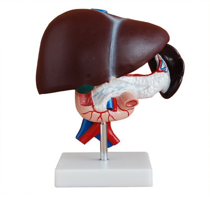 Демонстрационное учебное пособие - модель органов брюшной полости: печень, селезёнка, поджелудочная железа. Разбается на 3 части. Материал - пластик. На подставке.