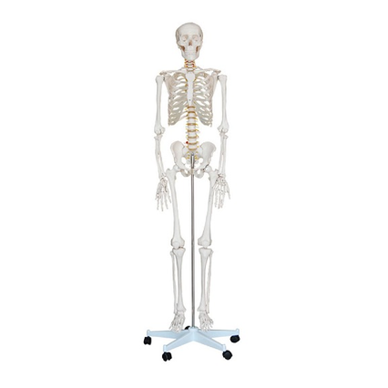 Анатомическая модель скелета взрослого человека в натуральную величину. Особенности модели: суставы верхних и нижних конечностей подвижны, нижние конечности съёмные; свод черепа разрезан поперечно и выполнен съёмным, нижняя челюсть подвижна, подвешена на пружине, съемные зубы 3 шт.; на позвоночнике представлены выходящие нервы и позвоночная артерия, грыжа поясничного диска. Материал - пластик. Поставляется на мобильной стойке.