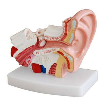 Пособие представляет собой модель уха в разрезе, увеличеную в 1,5 раза. Позволяет рассмотреть строение наружного, среднего и внутреннего уха. Модель установлена на прямоугольной подставке. Материал - пластик.
