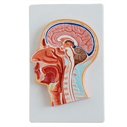 Демонстрационная рельефная модель с подробным изображением внутренних структур головы и шеи в саггитальном разрезе: отделы головного мозга, строение носовой и ротовой полостей, глотки, пищевода, гортани. Материал - пластик.